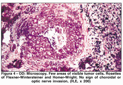 OD Microscopy - a few small areas of viable tumor cells, some forming Flexner-Wintersteiner and Homer-Wright rosettes. The retinal pigment epithelium was disorganized but there was no sign of choroidal invasion. The remaining optic nerve was free of neoplasia ( Figure 4).