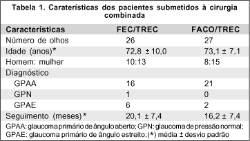 Os prontuários de 46 pacientes (53 olhos) submetidos à cirurgia combinada (FEC/TREC e FACO/TREC) na Clínica Oftalmológica da Santa Casa de São Paulo entre janeiro de 1996 e novembro de 1999 foram revisados. Os dados demográficos dos pacientes são mostrados na tabela 1. Os procedimentos foram realizados por diferentes cirurgiões de acordo com a mesma técnica.