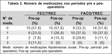 O número médio de medicações hipotensoras utilizadas no pré-operatório era 0,7 ± 1,0 no grupo FEC/TREC e 0,9 ± 0,8 no grupo FACO/TREC. O número médio de medicações pós-operatório diminuiu para 0,5 ± 0,7 (P=0,5) e 0,5 ± 0,7 (P=0,07), respectivamente. Estas diferenças, no entanto, não foram significantes. A tabela 2 mostra o número de medicações utilizadas nos períodos pré e pós-operatório. Quinze olhos do grupo FEC/TREC e 9 olhos do grupo FACO/TREC não faziam uso de qualquer medicação hipotensora ocular no período pré-operatório pelo fato de terem a cirurgia combinada indicada em sua consulta inicial no Serviço de glaucoma ou por não fidelidade ("adesão") ao tratamento clínico recomendado.