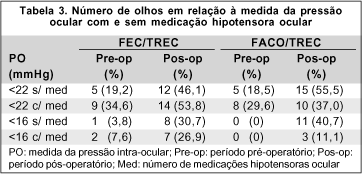 As medidas pré e pós-operatórias médias da PO no grupo FEC/TREC eram 24,2 ± 9,1 mmHg e 13,9 ± 3,6 mmHg, respectivamente (P<0,005). No grupo FACO/TREC as mesmas medidas eram 20,5 ± 5,2 mmHg e 16,2 ± 7,3 mmHg, respectivamente (P<0,02). A tabela 3 mostra o número de pacientes que obtiveram pressões menores que 22 mmHg e aqueles que obtiveram pressões menores que 16 mmHg com e sem medicação. No grupo FEC/TREC, 46,1% obtiveram PO < 22 mmHg sem medicação e no grupo FACO/TREC, 55,5% (P = 0,3). No grupo FEC/TREC, 30,7% e 40,7% do grupo FACO/TREC obtiveram PO < 16 mmHg sem medicação (P = 0,4).