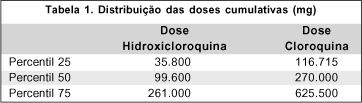 A dose cumulativa da cloroquina apresentou uma mediana (p50) de 270.000 mg, sendo que 25% (p25) dos pacientes usavam doses menores que 116.715 mg e 75% (p75) usavam doses acima 625.500 mg. A dose cumulativa da hidroxicloroquina apresentou uma mediana (p50) de 99.600 mg, sendo que 25% (p25) dos pacientes usavam doses abaixo de 35.800 mg e 75% (p75) abaixo de 261.000 mg (Tabela 1).