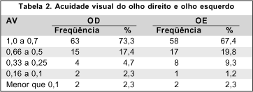 A acuidade visual do OD foi na maioria (63 olhos) 73,3% entre 0,7 e 1,0 (Snellen). A acuidade visual no OE foi 67,4% (58 olhos) entre 0,7 e 1,0 (Tabela 2).