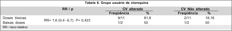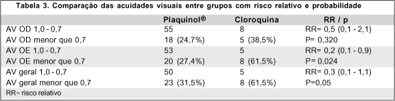 A acuidade visual nos chama a atenção já que no grupo usuário da cloroquina ela foi significativamente pior. Comparando-se as medidas das acuidades visuais entre os dois grupos foi observada uma diferença estatisticamente significativa (p=0,05), com risco relativo de 0,3 indicando a associação entre a exposição às drogas e a alteração na acuidade visual. Salientamos, portanto, a importância do exame da acuidade visual no acompanhamento dos pacientes em uso deste tipo de medicação.