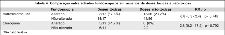 A oftalmoscopia dos usuários de cloroquina em dose não-tóxicas, nenhum paciente apresentou alterações e 5/11 pacientes (41,7%) usuários de doses tóxicas apresentaram alterações. O risco relativo foi de 2,8 (0,2-37,2) e p=0,792 o que não mostra associação entre achado fundoscópico comparando-se doses tóxicas com não-tóxicas. Nos usuários de hidroxicloroquina em doses não-tóxicas revelou 13/56 pacientes (23,2%) com alterações fundoscópicas. No grupo de usuários de doses tóxicas, somente 3/17 pacientes (17,6%) apresentaram alterações retinianas. O risco relativo foi de 0,8 (0,3 a 2,4) e o p=0,748 não apresentando diferença significativa nos achados fundoscópicos do grupo usuário de hidroxicloroquina comparando-se doses tóxicas com não-tóxicas. Isso mais uma vez vem mostrar a importância de ser realizado exame completo nas revisões para manter a liberação do uso da droga, incluindo exame da acuidade visual.