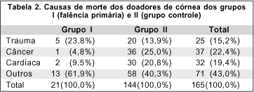 A Tabela 2 mostra as principais causas de morte dos doadores dos grupos I e II.