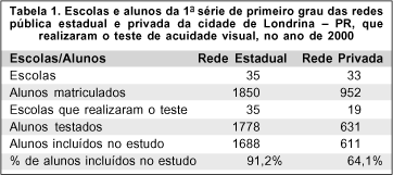 A prevalência de acuidade visual (A.V.) reduzida em alunos da primeira série do 1º grau da rede pública estadual na cidade de Londrina - PR - é desconhecida, não obstante a realização anual do teste de acuidade visual (A.V.) promovida pelo Núcleo Regional de Educação (NRE) da Secretaria Estadual de Educação (SEED) desde o ano de 1997. No que tange à rede privada, a adesão ao programa de teste de A.V. sempre foi baixa: apenas uma escola dentre as trinta e três que ofereciam a 1a série mostrou interesse no treinamento de professores para exame da acuidade visual dos alunos no ano de 1999.