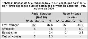 As outras causas de A.V. reduzida atingiram 5 crianças (2,3%) da rede pública estadual e nenhuma criança da rede privada (Tabela 2).
