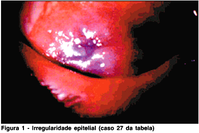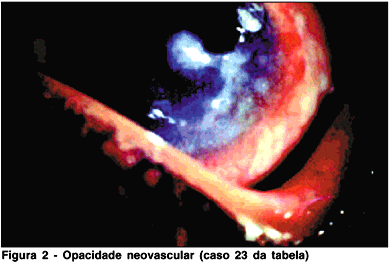 Os resultados da avaliação dos 27 pacientes com alterações de segmento anterior e AV menor ou igual a 0,6 são apresentados nas tabelas anexas. A idade variou de 3 a 45 anos com a média de 13 anos. Dezessete pacientes eram do sexo masculino e 10 do sexo feminino. As alterações de alta morbidade (27 casos selecionados) de segmento anterior foram: úlcera em escudo(UE), 5 casos; catarata, 3 casos; opacidade corneana(OP), 6 casos; perfuração ocular, 2 casos; ceratocone, 13 casos. Houve 7 cirurgias, sendo 2 transplantes de córnea tectônicos, 4 transplantes de córnea ópticos e uma ceratectomia, cujo diagnóstico de biópsia foi hiperplasia epitelial, proveniente de um caso com opacidade e irregularidade de córnea (Figura 1).