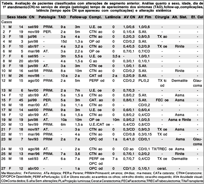 Houve relato de pacientes com ceratoconjuntivite vernal em que a percentagem de AV corrigida pior que 20/200 foi de 21%(7). No estudo em questão 12 pacientes dos 186 prontuários revistos tinham AV £ 0,1 no pior olho, cerca de 6,45% dos pacientes.