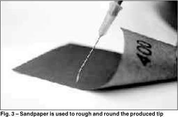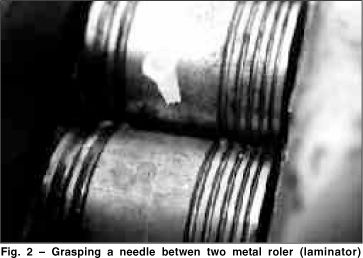 Two ways of producing the device are presented: with the aid of a laminator, or a hammer and a metal surface. The first consists of grasping the needle (or cannula) between two flat hard metal rollers ( Figure 2). It is rolled half an inch and rolled back. The needle is therefore flattened. Sandpaper is gently applied to the sharp tip (of the needle) to rough and round it ( Figure 3). The tip is bent to the desired angle, and sent to gas sterilization. The second way replaces the laminator with a hammer and a flat metal surface ( Figure 4). The needle is successively hit to produce a flat surface. Sandpaper and oxide sterilization follow in the same manner as described above. A handle may be used to ease the manipulation. Figure 5 shows the whole process from the cannula to the mounted instrument.