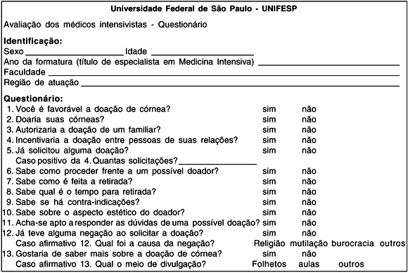 PURPOSE: To evaluate the knowledge and attitudes of intensive care physicians concerning corneal transplantation. METHODS: A questionnaire was answered by 100 intensive care physicians. RESULTS: All physicians knew about the procedure and were in favor of cornea transplantation, but only 57% had ever asked for a donation. Forty-four (44%) of all physicians did not feel able of answering questions by possible donors and all the physicians said to be interested in having more information about corneal transplantation. CONCLUSION: Information and education about transplantation in Medical Schools must be improved, in order to provide better understanding for intensive care physicians, in such a way that they could act more effectively when facing such situations.