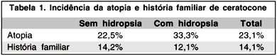 A ocorrência de história familiar de ceratocone no geral e em ambos os grupos do estudo não diferiu significativamente dos valores encontrados por outros autores. Ihalainen (1986) encontrou 15% de ocorrência familiar. Sallum e Erwenne(9) encontraram 20% de ocorrência familiar. Apesar da associação com atopia ter sido cerca de 10% mais freqüente no grupo com hidropisia, não se detectou significado estatístico nesta diferença. A atopia foi constatada em 32% de cem casos de ceratocone estudados por Copeman(10), e Rahi et al.(11) relataram atopia em 35% dos casos de ceratocone. Grewal et al.(12) em amostra de 22 casos de hidropisia em ectasias, encontraram em 95% história de alergia, e em 91% a ocorrência do hábito de coçar os olhos. Relataram também que em seis casos foi identificado pelo paciente um evento traumático precedendo a crise edematosa (4 coçaram vigorosamente o olho e em dois olhos houve inserção traumática da L.C.). Seis destes 22 pacientes (27%) apresentavam síndrome de Down. No presente estudo não foi pesquisada a ocorrência de evento traumático como fator desencadeante da crise por considerarmos esta informação, quando dada pelo paciente, muito inconsistente. Pacientes com síndrome de Down foram excluídos pois geralmente não permitem análise de características clínicas obtidas através de exame meticuloso. A inexistência de uma correlação estatisticamente significativa entre hidropisia, atopia e o coçar dos olhos na nossa amostra correspondem à observação clínica dos autores.