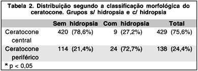 A comparação entre a classificação morfológica nos dois grupos encontra-se na tabela 2, sendo tal diferença estatisticamente expressiva, com o predomínio dos casos periféricos entre os pacientes com hidropisia, contrastando com a maioria de cones centrais entre os pacientes do grupo controle.