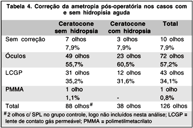A ceratoplastia penetrante foi realizada em 8,47% (90/1062) dos olhos do grupo controle, contrastando com 88,47% (38/43) daqueles que apresentaram hidropisia aguda. Somando-se os dois grupos, a cirurgia foi realizada em 11,6% dos olhos acompanhados. Uma vez que 8 pacientes do grupo com hidropisia e 12 pacientes do grupo controle submeteram-se a cirurgia bilateral, tem-se que 19% dos nossos pacientes precisaram de cirurgia durante o acompanhamento do ceratocone. O resultado, após seguimento mínimo de um ano, foi semelhante entre os dois grupos do estudo, tanto em relação à acuidade visual corrigida, quanto ao tipo de correção ótica empregada após a cirurgia. A maioria dos olhos (72%) alcançou acuidade corrigida melhor que 20/40, sendo óculos o dispositivo mais empregado na correção da ametropia pós-cirúrgica (Tabelas 3 e 4). Dois olhos tornaram-se amauróticos (2/126 = 0,016%) em conseqüência de graves complicações cirúrgicas. Um por endoftalmite pós-operatória aguda, e outro por glaucoma refratário ao tratamento clínico e cirúrgico. Oito olhos operados apresentaram episódio de rejeição (6,35%), todos tratados sem comprometimento da transparência ou da acuidade visual. A incidência de rejeição não diferiu significativamente entre os grupos. Cinco olhos (3,97%) desenvolveram catarata após o transplante e foram submetidos a facectomia com LIO.