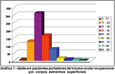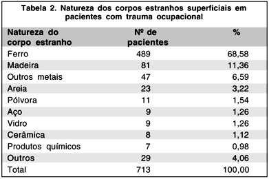Os corpos estranhos superficiais, facilmente preveníveis com o uso de proteção adequada, constituem uma importante causa de traumas ocupacionais, trazendo perdas econômicas, sociais e psicológicas. Neste estudo a atividade desenvolvida principalmente por homens na metalurgia, serralheria e mecânica foi a principal causa de trauma ocular, e o ferro e outros metais os principais corpos estranhos envolvidos.