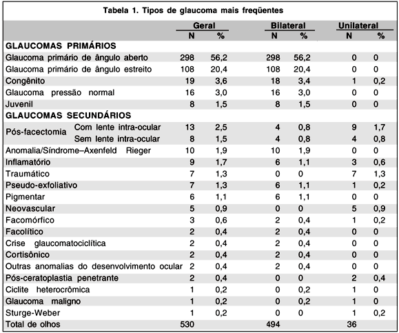A Tabela 1 revela os tipos de glaucoma observados neste estudo. Os mais freqüentes foram: glaucoma primário de ângulo aberto (GPAA) - (56,2%, n=298), glaucoma primário de ângulo estreito (GPAE) - (20,4%, n=108), glaucoma pós-facectomia (4%, n=21), glaucoma congênito - (3,6%, n=19) e glaucoma de pressão normal (GPN) - (3%, n=16). Dentre os glaucomas bilaterais, os mais freqüentes foram: GPAA (60,3%; n=298), GPAE (21,9%; n=108), glaucoma congênito (3,7%, n=9) e glaucoma de pressão normal (3,2%; n=8). Dos 36 glaucomas unilaterais, os mais freqüentes foram: pós-facectomia (36,1%, n=13), traumático (19,4%, n=7), neovascular (13,8%, n=5) e inflamatório (8,3%, n=3).