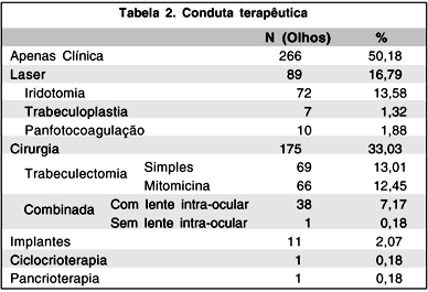 Todos os pacientes receberam inicialmente orientação para começar tratamento medicamentoso. A análise retrospectiva da evolução destes pacientes evidenciou que 33,03% (n=175) dos casos necessitaram de intervenção cirúrgica, enquanto 50,18 % (n=266) dos casos mantiveram-se recebendo exclusivamente terapêutica medicamentosa. Os 89 olhos restantes (16,79%) foram submetidos ao tratamento a laser, seguido ou não de tratamento medicamentoso. Dos casos estudados,13,01%(n=69) foram submetidos à trabeculectomia (TREC) simples, e 12,45% (n=66) a TREC com antimetabólito (mitomicina), 7,16% (n=38) a cirurgia combinada de trabeculectomia e facectomia com lente intra-ocular (LIO) e 0,18% (n=1) a cirurgia combinada sem LIO. Trabeculoplastia foi realizada em 1,32% (n=7), iridotomia em 13,58% (n= 72) e panfotocoagulação em 1,88% (n=10) dos olhos. Onze casos (2,07%) necessitaram ser submetidos ao implante de tubo, 1 (0,18%) à ciclocrioterapia e 1 (0,18%) à pancrioterapia (Tabela 2).