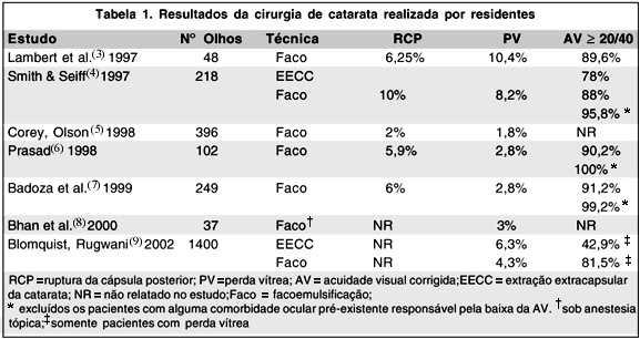 Nenhuma técnica cirúrgica está isenta de complicações. Espera-se que sejam mais freqüentes quando a cirurgia é conduzida por um cirurgião inexperiente. Entretanto, os resultados apresentados a seguir sugerem que mesmo o cirurgião em treinamento pode obter experiência sem submeter o paciente a um índice de complicações indesejáveis. Em 1992, Cruz et al.(1) e Allinson et al.(2) relataram os primeiros resultados das cirurgias de facoemulsificação com implante da lente intra-ocular (LIO) realizadas por residentes. No estudo de Cruz et al.(1), em 181 cirurgias, houve ruptura da cápsula posterior (RCP) em 10% dos casos e perda vítrea (PV) em 5,5%; enquanto no estudo de Allinson et al.(2), a incidência de PV foi de 14,7% (20 PV em 136 cirurgias) e a de RCP não foi relatada. Nos dois estudos, as cirurgias foram realizadas por residentes do terceiro ano, com treinamento prévio na técnica de extração extracapsular da catarata (EECC) e sob a supervisão de um cirurgião experiente. Essa diferença de quase três vezes na incidência de PV, entre os estudos, pode ser parcialmente explicada pela seleção pré-operatória inadequada dos pacientes no estudo de Allinson et al.(2). Um terço dos 20 casos de PV ocorreu em situações em que se poderia prever a dificuldade técnica da cirurgia. Não deveriam, portanto, ter sido operados por residentes no início da curva de aprendizado. Cinco desses casos ocorreram em olhos com pupila pequena e dois em olhos com esclerose nuclear de 4+. Após esses estudos, vários outros relataram bons resultados da cirurgia de facoemulsificação realizada por residentes(3-9) (Tabela1), comparáveis aos de cirurgiões experientes, também no início das suas curvas de aprendizado da facoemulsificação(10-13).