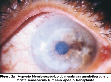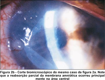 À biomicroscopia, foi observado que a membrana adere-se bem à superfície da córnea, com transparência maior no centro do que na periferia e apresentando aspecto estético bastante satisfatório (Figuras 1a e 1b). Após 1 ano de seguimento, observou-se que dos 9 casos, 3 (33,3%) apresentaram manutenção, 3 (33,33%) apresentaram reabsorção parcial e 3 (33,33%) apresentaram reabsorção total da membrana amniótica transplantada. (Figuras 2a e 2b). Nenhum paciente apresentou alteração da vascularização corneana.