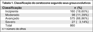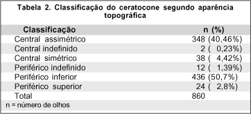 O ceratocone, segundo seu grau evolutivo foi classificado em 4 grupos(9): incipiente (leituras ceratométricas menores que 45,00 dioptrias (D) nos dois meridianos); moderado (leituras entre 45,00 e 52,00 D nos dois meridianos); avançado (leituras entre 52,00 e 62,00 D nos dois meridianos) e severo (leituras maiores que 62,00 D nos dois meridianos). Neste estudo, quando os 2 meridianos não se encontraram dentro do mesmo grupo, classificou-se o ceratocone pelo meridiano mais curvo. Quanto à aparência videoceratoscópica, a classificação utilizada foi de acordo com a localização do ápice do cone(10): central simétrico, central assimétrico, central indefinido, periférico superior, periférico inferior e periférico indefinido.