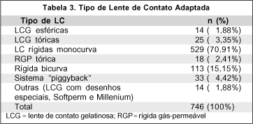 Nos casos de insucesso com as RGP e LCG, utilizou-se o sistema "piggyback" e, raramente, a LC híbrida (tipo Softperm).