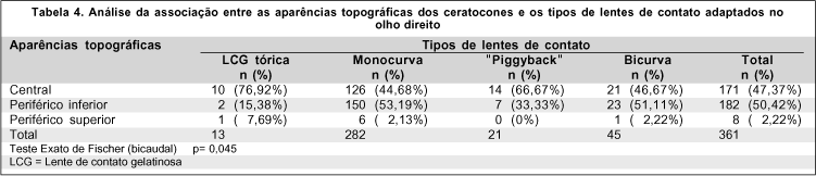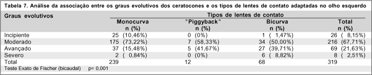 Devido à baixa freqüência de algumas categorias presentes nas variáveis, para análise estatística da associação entre Padrão Topográfico do ceratocone e Tipo de LC adaptada, considerou-se somente as variáveis: 1) Padrão Topográfico: central (simétrico e assimétrico), periférico inferior e periférico superior; e 2) Tipo de Lente adaptada: RGP monocurva, RGP bicurva, LCG tórica e sistema "piggyback". Para avaliar a associação entre Grau Evolutivo e Tipo de Lente adaptada, considerou-se as variáveis: 1) Grau Evolutivo: incipiente, moderado, avançado e severo; e 2) Tipo de Lente adaptada: RGP monocurva, RGP bicurva e sistema "piggyback".