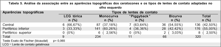 A análise das variáveis Padrão Topográfico e Tipo de Lente adaptada demonstrou, no Olho Direito, associação estatisticamente significante (p = 0,045): 1) LCG tóricas e sistema "piggyback" tiveram um percentual maior de adaptações em cones centrais; 2) LCG tóricas, em cones superiores. Com as LC RGP monocurvas e bicurvas, o percentual de adaptações foi semelhante, em relação aos padrões topográficos estudados (Tabela 4). No Olho Esquerdo não se observou associação estatisticamente significante (p=0,065), mas verificou-se uma leve tendência: 1) LCG tóricas, RGP bicurvas e sistema "piggyback" tiveram um percentual maior de adaptações nos cones centrais; e 2) LC RGP monocurvas, nos cones inferiores (Tabela 5).
