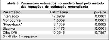 Ao se analisarem os resultados do Modelo pelo método das EEG, observou-se que os pacientes que utilizavam as RGP monocurvas, bicurvas ou o sistema "piggyback" apresentavam ceratocone mais avançado, principalmente os olhos adaptados com LC bicurva ou com o sistema "piggyback". Não se observou diferença no grau evolutivo com relação ao olho afetado (Tabela 8). As demais variáveis não foram significativas.