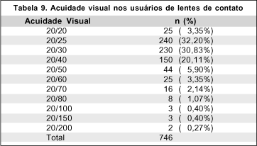 A AV média dos usuários de LC foi de 20/35 (±16,75), variando de 20/20 a 20/200, sendo que 86,5% dos olhos alcançaram 20/40 ou mais (Tabela 9).