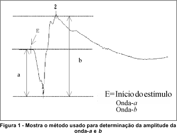 A amplitude da onda-a é medida da linha de base até o pico negativo, seguido pela amplitude da onda-b até o pico positivo. Estes dois valores são usados no cálculo da relação b/a (figura 1). As latências da onda-a e b foram medidas a partir do início do estímulo até os respectivos picos(13).