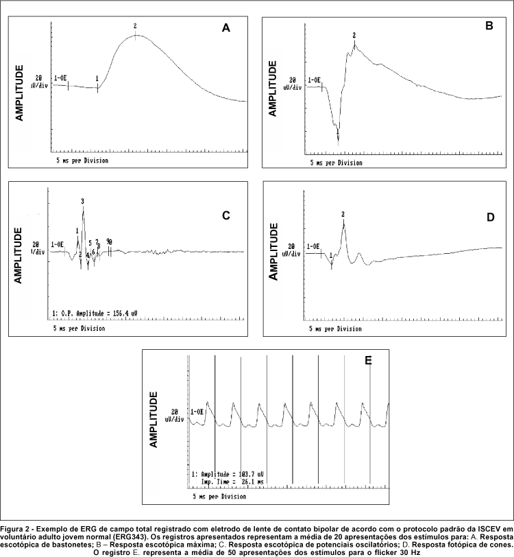 A Figura 2 mostra um exemplo de registro das 5 respostas eletrorretinográficas que compõem o protocolo padrão da ISCEV em um voluntário adulto jovem normal.