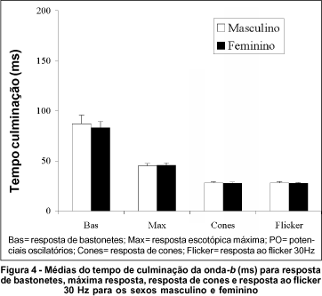 A análise da amplitude e do tempo de culminação com relação ao sexo demonstrou haver diferença estatística significativa apenas na amplitude da resposta escotópica máxima, apesar de notarmos que a amplitude pico-a-pico da onda-b seja discretamente maior e o tempo de culminação discretamente menor no sexo feminino nos outros parâmetros do protocolo padrão, estando de acordo com vários trabalhos que concluíram haver diferença estatisticamente significativa na amplitude da onda-b entre os dois sexos, sendo a amplitude da onda-b maior e o tempo de culminação menor no sexo feminino(16-17), a razão para esta diferença não foi explicada(16).