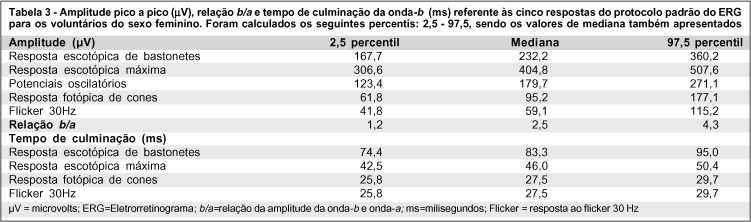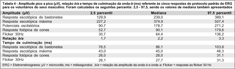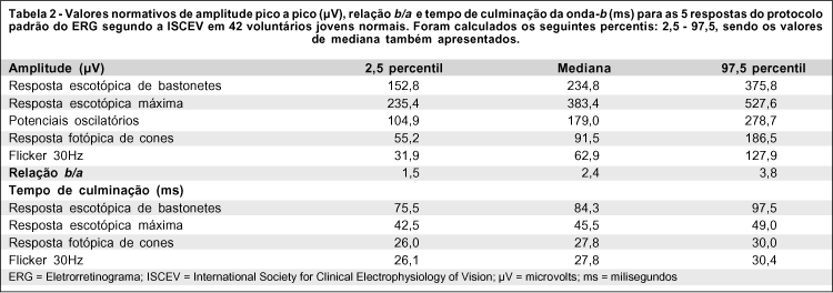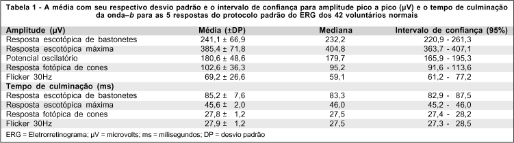 A tabela 1 mostra valores de média e respectivo desvio padrão, mediana e intervalo de confiança de 95% para a amplitude pico-a-pico (mV) e o tempo de culminação da onda-b (ms) dos achados eletrorretinográficos de 42 voluntários normais. De acordo com a recomendação da ISCEV, foram incluídos na tabela 2 os valores dos achados eletrorretinográficos das 5 respostas do protocolo padrão e a relação b/a com relação ao 2,5 e 97,5 percentis dos 42 sujeitos estudados.