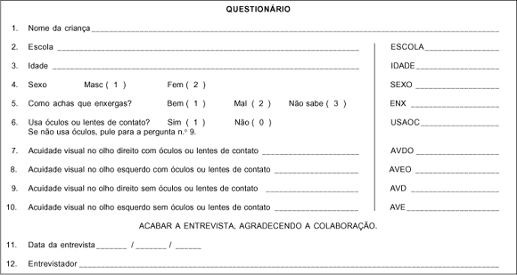 O teste da acuidade visual foi precedido pela aplicação de um questionário padronizado (ver em anexo), previamente validado, onde constava a identificação da escola, do escolar e do entrevistador, em que foram investigadas as seguintes variáveis: