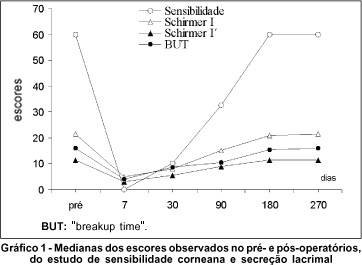 Para a sensibilidade corneana observou-se que no pré-operatório o valor mediano foi de 60,0 mm que, no pós-operatório, apresentou escores zero após 7 dias, 10,0 mm após 30 dias, 32,5 mm após 90 dias e 60,0 mm após 180 e 270 dias. A análise estatística mostrou que após 90 dias não havia diferença estatisticamente significante com o pré-operatório, considerando-se que a sensibilidade corneana tenha retornado ao estado pré-operatório, clinicamente, após 180 dias.