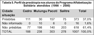 Foram examinados 1007 alunos (Tabela 1). Observamos que cerca da metade dos alunos (46%) tinha baixa de acuidade visual (acuidade visual menor que 0,8 em um ou ambos os olhos), dificultando a aprendizagem na escola (Tabela 2). 66,33% precisaram de correção óptica (Tabela 3), sendo que 15,44% eram hipermétropes simples com dioptria menor ou igual a + 3,00, seguidos em 13,70% por hipermetropia combinada com astigmatismo (astigmatismo hipermetrópico composto) menor que +3,00 dioptrias (Tabela 4). Trinta e sete por cento eram présbitas (Tabela 5); e observamos um único paciente présbita entre aqueles abaixo dos 35 anos de idade (Tabela 6). Os óculos foram doados pela Secretaria de Saúde (Salitre e Cedro) e pelo Projeto Ver (Pacoti e Mulungu).
