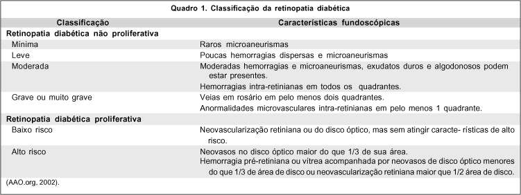 A RD tem início nos capilares retinianos pelo comprometimento da barreira hemato-retiniana(7-8). As alterações fundoscópicas seguem um curso progressivo, desde a RD leve, caracterizada por aumento da permeabilidade vascular, até a moderada e a grave, caracterizada por oclusão vascular e conseqüente proliferação fibrovascular (neovasos na retina e face posterior do vítreo) e cicatrização(9). A classificação da RD, adotada pela Academia Americana de Oftalmologia(10) considera a presença destes estágios evolutivos, conforme está descrito no Quadro 1. Em qualquer estágio da RD pode ocorrer diminuição importante da acuidade visual causada por edema macular. Edema macular é definido pela presença de espessamento retiniano por acúmulo de fluidos dentro de 150 a 300m do centro da mácula, e é a maior causa de diminuição da acuidade visual, principalmente em pacientes com DM tipo 2(3).