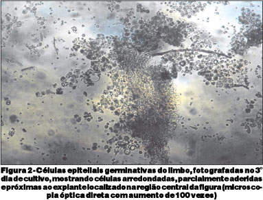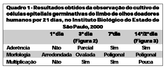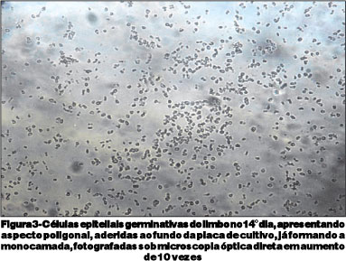 A elaboração deste estudo resultou de uma série de experiências e adaptações às diferentes condições citadas na bibliografia do assunto. Neste experimento, a presença de células germinativas no cultivo de células límbicas foi confirmada pela eficiência de formação de colônia de vários agrupamentos celulares. Somente células germinativas são capazes de estabelecer colônias com mais de 40 células a partir de uma célula progenitora(12). Células do epitélio da córnea e da conjuntiva não são capazes de estabelecer cultura por mais de 14 dias, pela perda da capacidade de multiplicação e aderência, ao adquirirem características de senescência e vacuolização. A utilização desta técnica de avaliação, e não do uso de marcadores indiretos de células límbicas, que podem contribuir para o melhor controle do grau de pureza do cultivo, foi devido à impossibilidade daimportação dos marcadores histoquímicos de células epiteliais germinativas, pelo seu elevado custo financeiro.