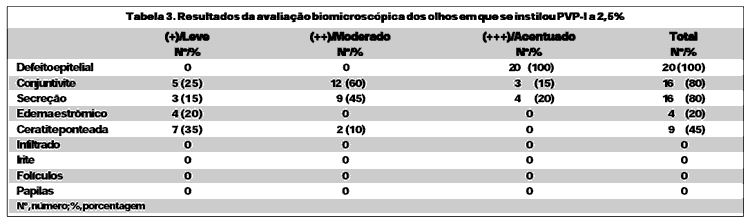 Na avaliação em lâmpada de fenda, observou-se a persistência de defeito epitelial em 100% dos casos em que se instilou a solução de iodo-povidona a 2,5%. Conjuntivite ocorreu em 100% dos casos e esteve presente a partir das primeiras 24 horas de uso do colírio, sendo que no 3º dia de observação foi considerada leve em 25% dos casos, moderada em 60% e acentuada em 15%. Secreção branca, de aspecto mucoso, foi observada em 80% dos casos após 72 horas de uso da medicação, sendo que em metade dos casos apareceu nas primeiras 24 horas e nos demais casos foram observados a partir de 48 horas. Observou-se, ainda, edema estrômico leve em 20% dos casos e ceratite ponteada leve em 35% e moderada em 10%, após 72 horas do início do experimento (Figura 2). Estes achados estão ilustrados na Tabela 3. Não foram observadas, em nenhum olho deste grupo, opacidades corneais, infiltrados, irite, reação folicular ou papilar.