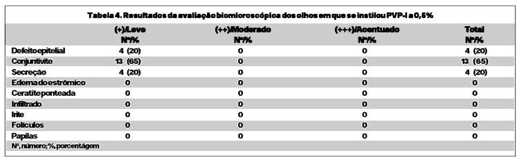 Nos olhos em que se utilizou a solução de iodo-povidona a 0,5%, observou-se regeneração completa do defeito epitelial em 80% dos casos após 72 horas de tratamento, ocorrendo diminuição das dimensões da lesão corneal ao longo deste período e reepitelização completa em 30% nas primeiras 48 horas. Outros achados foram conjuntivite leve em 65% e a presença de secreção branca de aspecto mucoso em 20% após 72 horas de uso da medicação (Figura 3). Não foram observadas, em nenhum olho deste grupo, opacidades corneais, infiltrados, irite, reação folicular ou papilar. Estes achados estão ilustrados na Tabela 4.