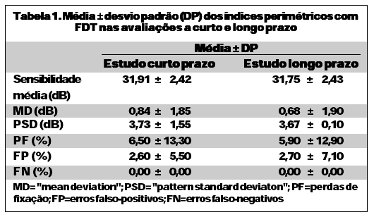 A tabela 1 mostra as médias de sensibilidade, MD, PSD, número de perdas de fixação, número de erros falso-positivos e número de erros falso-negativos dos quatro primeiros exames realizados (avaliação a longo prazo) e dos três exames realizados no mesmo dia (avaliação a curto prazo).