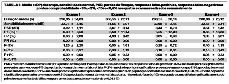 A tabela 2 revela as médias da duração do exame, da sensibilidade central, PSD, número de perdas de fixação, respostas falso-positivas, respostas falso-negativas e número de áreas alteradas com p < do que 5%, 2%, 1% e 0,5% dos quatro exames realizados semanalmente. Não houve diferença estatisticamente significativa quando se compararam estes parâmetros nas diversas sessões, com exceção do número de perdas de fixação do segundo exame que diferiu significativamente do primeiro exame (p=0,013).