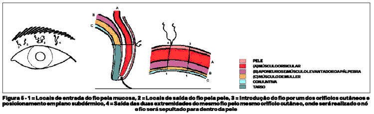 Iniciamos a cirurgia evertendo-se a pálpebra superior e expondo a conjuntiva com auxílio de pinça. É realizado um ponto em forma de U na projeção conjuntival da marca cutânea com fio de náilon 9-0 montado em agulhas curvas cilíndricas nas suas duas extremidades, da conjuntiva para a pele. O fio atravessa todas as camadas da pálpebra superior, tangenciando a margem superior do tarso. O fio (ponto em "U") é exteriorizado na pele nas bordas da marcação. Uma das extremidades do fio é passada de um extremo da marca na pele para o outro no plano intradérmico, introduzindo-se uma das agulhas pelo mesmo orifício de sua saída na pele e exteriorizando-a no orifício de saída da outra extremidade do fio (Figura 2, 3, 4 e 5). O mesmo tipo de ponto é realizado nas outras marcas e na pálpebra contralateral.