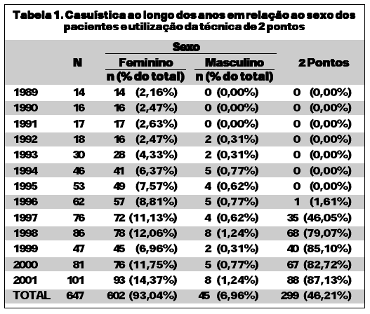 Todos os pacientes foram operados pela mesma equipe cirúrgica e com a técnica sem incisão cirúrgica descrita posteriormente. A partir de 1996, foi iniciado o uso da técnica com apenas dois pontos, sendo operado 299 pacientes (46,21%) com essa técnica até 2002 (Tabela 1).