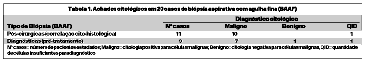 Entre os casos com quantidade suficiente de material, todos tiveram uma correlação cito-histológica positiva. Tal fato provavelmente se deve à amostra reduzida apesar da BAAF tem se mostrado um método diagnóstico de boa confiabilidade, geralmente superior a 90%(1,5-7,11,13,15).