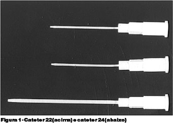 Diante das limitações e possíveis complicações inerentes aos métodos já conhecidos de reparação de lacerações canaliculares, os autores apresentam esta nova técnica utilizando o cateter de teflon como molde intracanalicular somente durante reparação cirúrgica. O bizel da agulha deve ser removido para que não lese a parede do canalículo e não faça uma falsa via. É importante que a agulha seja mantida dentro do cateter, pois só assim é possível torná-lo mais rígido e de mais fácil introdução no ponto lacrimal. Geralmente são utilizados os cateteres 22 em crianças e 24 em adultos (Figura 1). Acredita-se que esta técnica, além de ser mais prática por empregar material de fácil acesso, é um procedimento pouco traumático e de simples execução. Por ser constituído de um material mais rígido, modela o canalículo, facilitando a sutura sem risco de transfixar o tubo. A nova técnica oferece um menor número de complicações inerentes ao uso de modeladores. Ao final da cirurgia o cateter é removido e nenhum outro modelador é mantido na luz do canalículo. Esta técnica é indicada em todos os casos de lacerações canaliculares regulares, transversais e oblíquas, que possibilitem a cateterização.