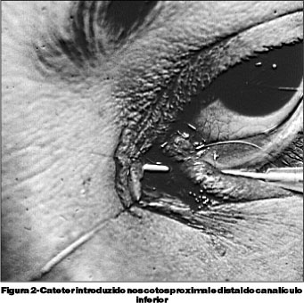 Coloca-se um fio de tração Vicryl® (5-0) no tarso entre as bordas da ferida para permitir a sua aproximação, facilitando a sutura do canalículo, com o fio de nylon monofilamento (Mononylon®) ou poliglactina trançada (Vicryl®). Identificados os cotos do canalículo, introduz-se um catéter de teflon (número 22 ou 24) no lúmem canalicular (Figura 2). Antes de introduzí-lo deve-se cortar o bizel da agulha com a pinça Kelly e mantê-la dentro do catéter durante todo procedimento.