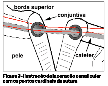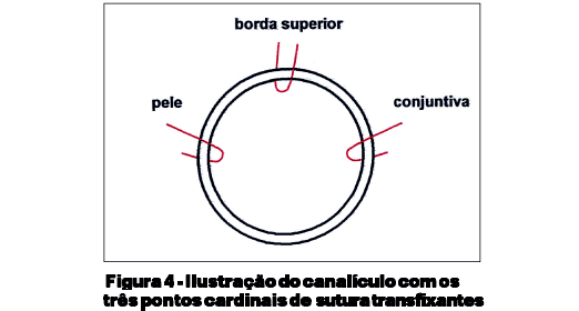 Canalículo: são passados 3 pontos cardinais transfixantes 8-0 que propiciam maior firmeza da sutura (Figuras 3 e 4).