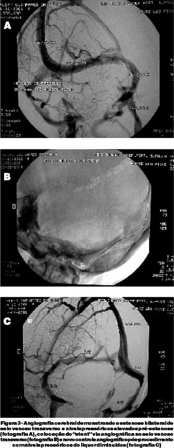 A tomografia computadorizada (TC) e a ressonância magnética (RM) do encéfalo apresentaram-se sem alterações significativas, demonstrando sinais de hipertensão intracraniana e provável estenose bilateral dos seios transversos. A angiografia cerebral confirmou estenose grave na transição do terço médio com o distal de ambos os seios transversos, havendo comprometimento luminar de aproximadamente 50% (figura 3). No cateterismo venoso, a pressão do golfo jugular, foi de 9 mmHg à direita e 8 mmHg, na porção inicial dos seios transversos foi 28 mmHg à direita e 31mmHg, na porção distal do seio sagital superior de 45 mmHg.