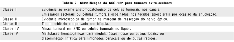 Para os pacientes portadores de tumores intra-oculares adotamos o esquema de estadiamento preconizado por Reese-Ellseworth(13), (Tabela 1) e para os portadores de doença extra-ocular, adotamos a classificação do CCG (Tabela 2)(14).
